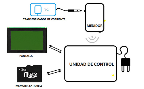 El sistema mide la corriente consumida por la residencia mediante un transformador de corriente, estos datos se transmiten de forma inalámbrica desde el medidor a la unidad de control. Ésta obtiene los valores de voltaje a través de la alimentación de red que, con los valores de corriente, son procesados para la obtención de los valores de potencia activa y coste. Seguidamente estos datos se exponen en pantalla y son almacenados. En pantalla se muestra al usuario su gasto energético en kilovatioshora y su coste económico en euros.