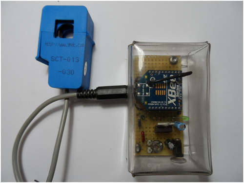 El medidor de corriente se encarga de la obtención de los valores de la corriente de la red eléctrica. Está compuesto por un transformador de corriente, para la lectura de los valores; una interfaz de modulación, para adaptar la señal de salida del sensor a la entrada de la antena; y una antena XBee, para la comunicación inalámbrica.