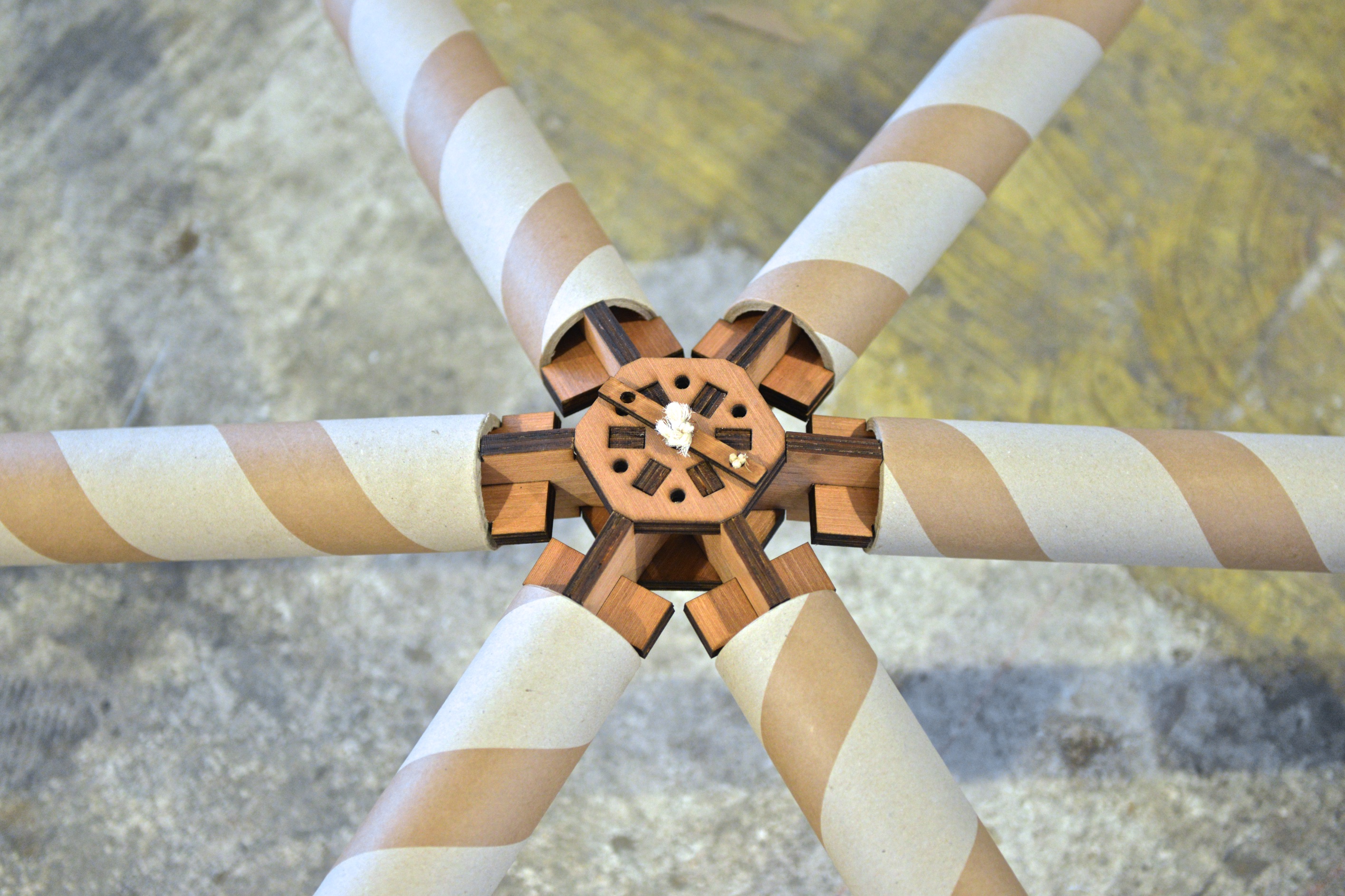 A plywood hub detail, which differed greatly from the 3D printed ball-socket connector from the first prototype, was developed based on two principles. First, it had to be able to be rapid prototyped using laser cutting so each design iteration could be cut and tested at 1:1 scale as quickly as possible. Second, the hub needed to support the position of the paper tubes rigidly during the assembly process as the whole system was meant to be assembled without the need for auxiliary structures such as cranes, scaffoldings or additional supports.